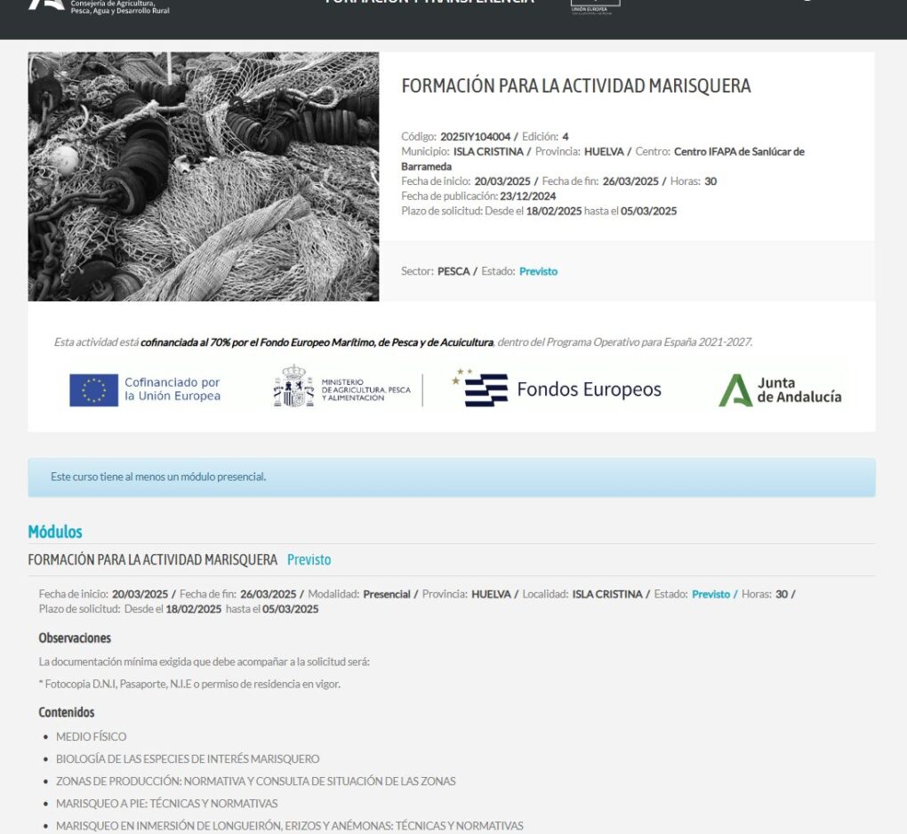 Os recordamos que la realización de dicho curso se valora con 15 puntos en los procesos de concesión de licencias de marisqueo a pie y de inmersión.