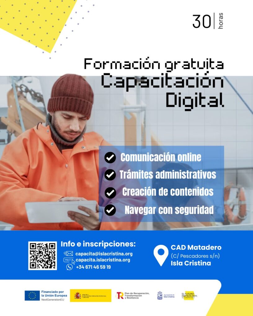 El Ayuntamiento de Isla Cristina ha anunciado el inicio, el próximo lunes 31 de marzo, de cursos gratuitos de capacitación digital en el CAD Matadero entre los meses de abril y junio.