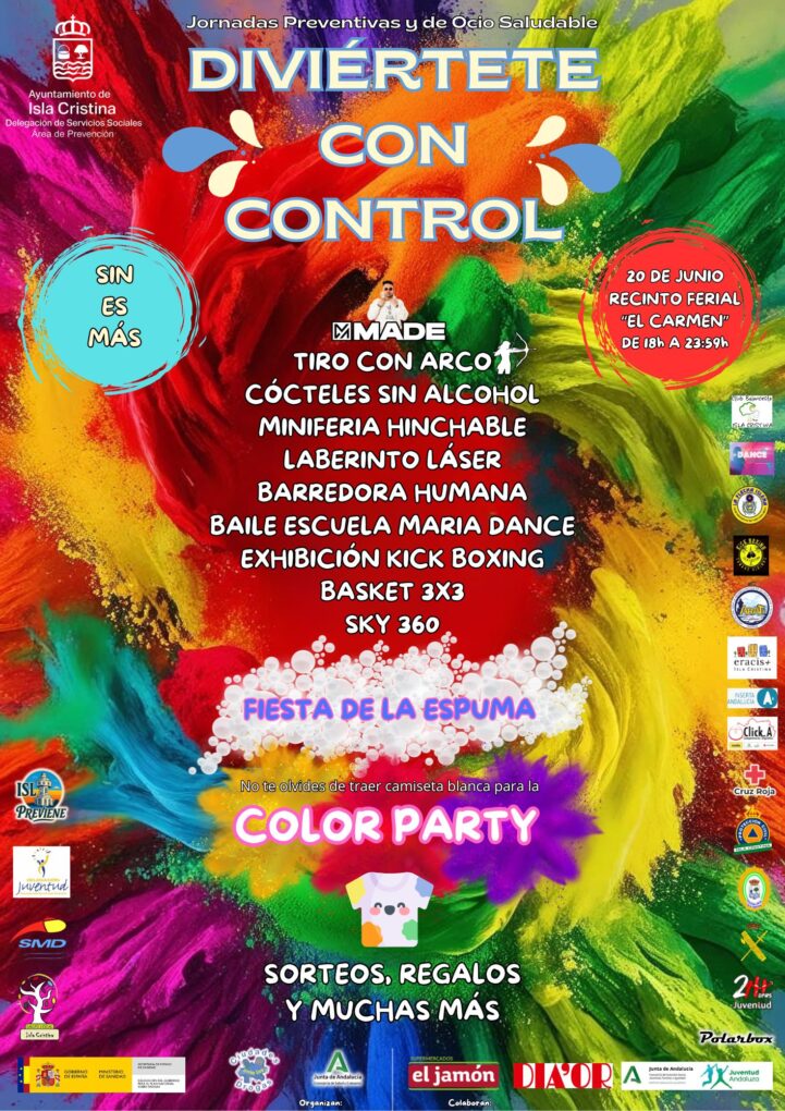 Isla Cristina acogerá el próximo viernes, 20 de junio, por sexto año, las ya conocidas Jornadas Preventivas y de Ocio Saludable, que, bajo el eslogan “SIN ES MÁS. DIVIÉRTETE CON CONTROL” y organizadas por las delegaciones de los Servicios Sociales Comunitarios, Juventud y Deporte y salud y Consumo respectivamente, se celebrarán dentro del Recinto de Ferias y Exposiciones «El Carmen» dirigidas a menores, adolescentes y jóvenes de entre 11 a 18 años de la localidad y alrededores, que se llevan a cabo en el marco del Programa IslaPreviene-Ciudades ante las Drogas y enmarcadas en el II Plan Local de Salud.