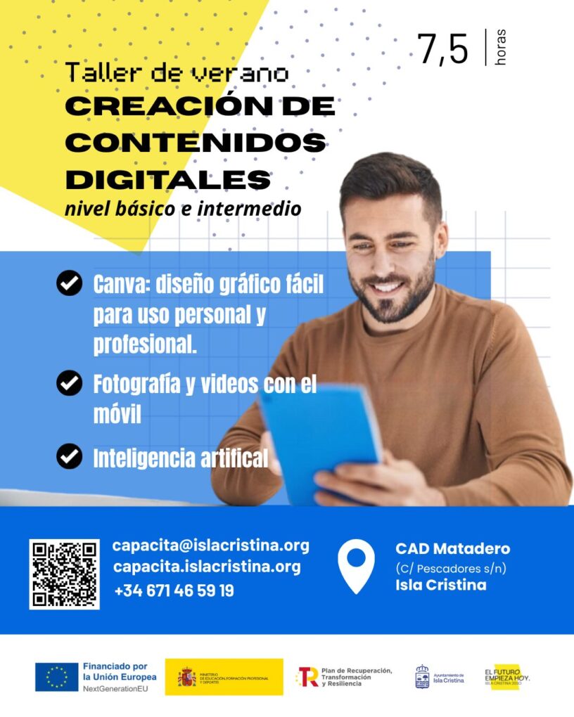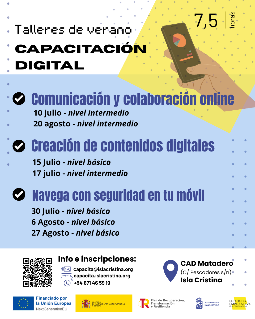 El Ayuntamiento de Isla Cristina, a través del Centro de Capacitación Digital situado en el CAD Matadero, pone en marcha una nueva programación de talleres de verano gratuitos dirigidos a toda la ciudadanía, con el objetivo de seguir reduciendo la brecha digital en el municipio y facilitar el acceso a las tecnologías de la información.