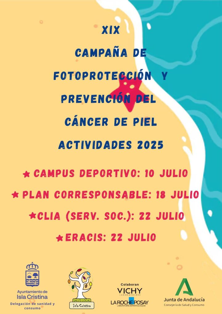 El Ayuntamiento de Isla Cristina, a través de la delegación de Salud, vuelve a poner en marcha, como cada verano desde 2007, la XIX Campaña de Fotoprotección y Prevención del Cáncer de Piel.