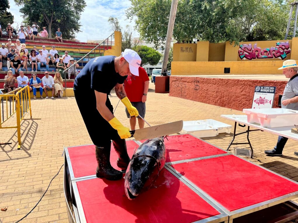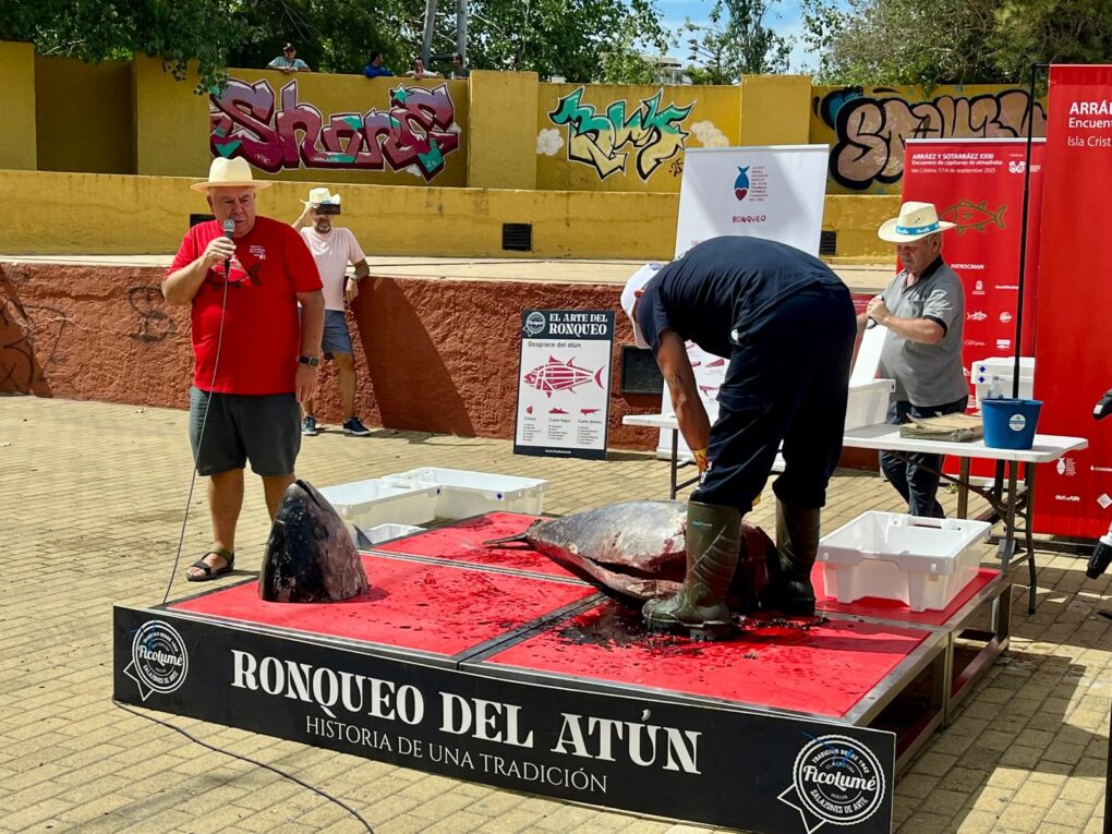 Durante la jornada, el público pudo conocer en detalle la técnica del ronqueo, observar cómo se despieza un atún de 100 kilos en 33 partes distintas y aprender curiosidades sobre la especie, su migración y sus cualidades nutricionales. Los asistentes recibieron además gorros conmemorativos donados por el Ayuntamiento para protegerse del sol, que marcó el inicio de las actividades al aire libre.